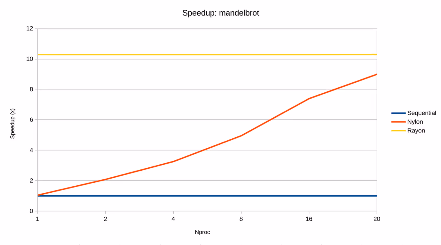 Another thing to note is that while matrix multiplication is a highly uniform workload, Mandelbrot set calculation is highly irregular. This could therefore be pointing at our engine being more optimized for balanced workloads, and less so for imbalanced ones. This makes intuitive sense, since rayon uses a more sophisticated adaptive work allocation scheme.