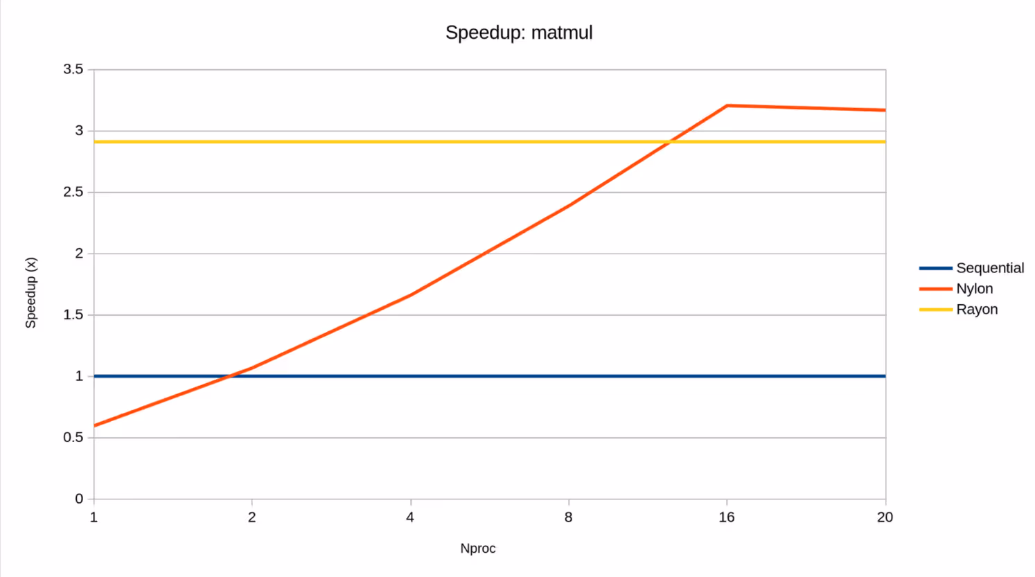 We included rayon’s performance at 20 threads as an aspirational target. Overall, our library generated good speedup, although the speedup did not scale non-linearly.